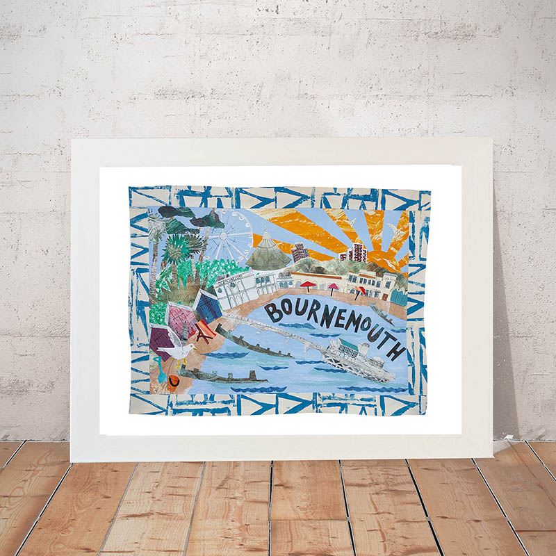 • The artwork features the pier, gardens and some of the beachside buildings and beach huts of Bournemouth in Dorset.